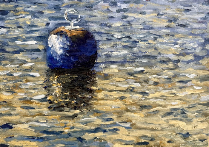 A small(7x5) study of blue buoy off Back Beach. I was attracted to the reflected golden light around the buoy which I tried to capture in oils…