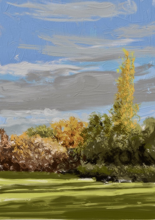 A digital sketch in Art Set 4, working on the iPad with simulated oil brushes and paint. The scene is afternoon light on one of the poplar tree at the entrance to the Southwell Trail.
