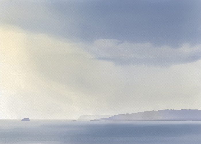 A digital watercolour of Hope’s Nose with Berry Head beyond, finished in Rebelle 8, has me constantly amazed by the functionality of art apps. For example, Rebelle captures the unpredictability of watercolour through its screen movement and blending. Just like real water, there’s no way to predict the outcome and all happy accidents are welcome. More control is achieved by adjusting the digital brush size and water flow both on the surface and within the brush. This includes ‘quick drying’ the surface, the digital equivalent of a hairdryer.
