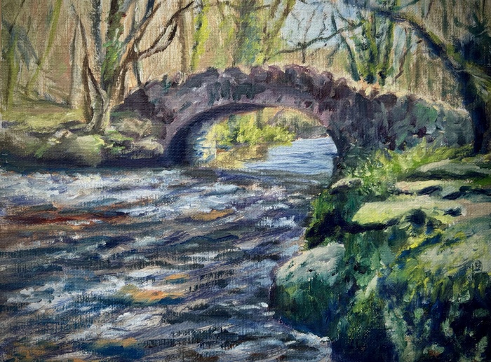 Hisley Bridge, over the River Bovey on Dartmoor, painted in oils, approximately 12x9 inches.