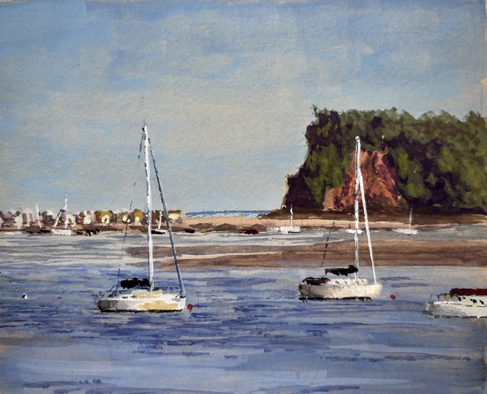 The view from Polly Steps in Teignmouth, painted outdoors in gouache on beige paper(approx 16x12cm).